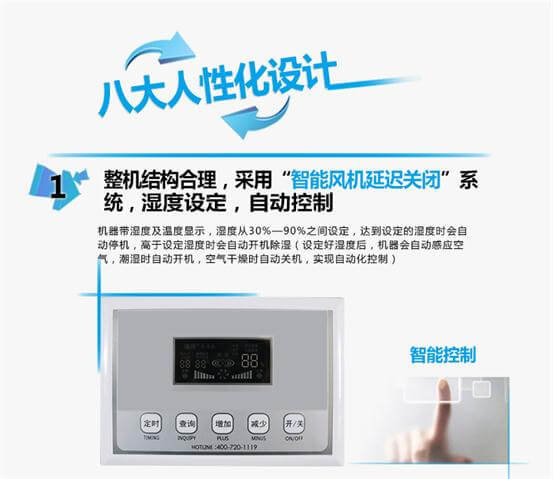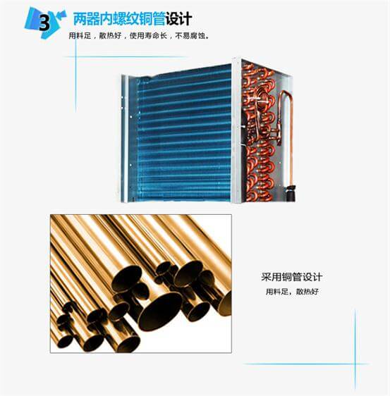 由風(fēng)扇將潮濕空氣吸入機內(nèi),通過壓縮機制冷系統(tǒng)將蒸發(fā)器表面降到空氣的露點溫度以下,此時潮濕的空氣經(jīng)過蒸發(fā)器時,空氣中的水會分解出來并附在蒸發(fā)器表面(注:就像夏天我們從冰箱拿出一瓶水,一會瓶子的外面有一層冷凝水一樣的原理),水會順著蒸發(fā)器上的親水箔到積水托盤再流到水箱或排水管排出,除濕過的干燥冷空氣經(jīng)過冷凝器加熱后排出機外,如此循環(huán)使內(nèi)外溫度降低。