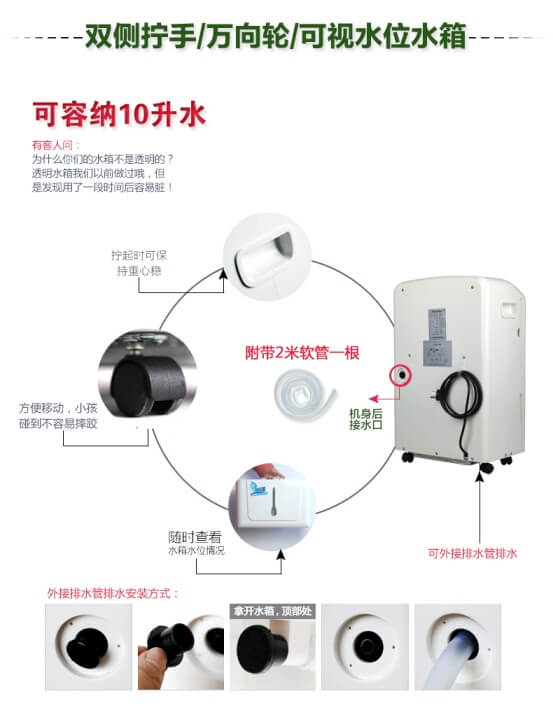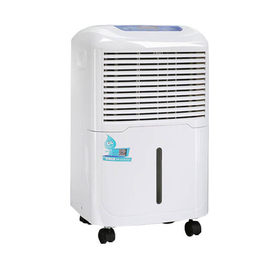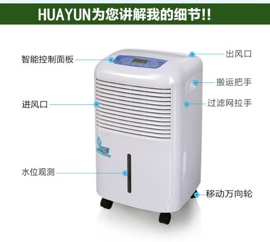 由風扇將潮濕空氣吸入機內,通過壓縮機制冷系統將蒸發器表面降到空氣的露點溫度以下,此時潮濕的空氣經過蒸發器時,空氣中的水會分解出來并附在蒸發器表面(注:就像夏天我們從冰箱拿出一瓶水,一會瓶子的外面有一層冷凝水一樣的原理),水會順著蒸發器上的親水箔到積水托盤再流到水箱或排水管排出,除濕過的干燥冷空氣經過冷凝器加熱后排出機外,如此循環使內外溫度降低。