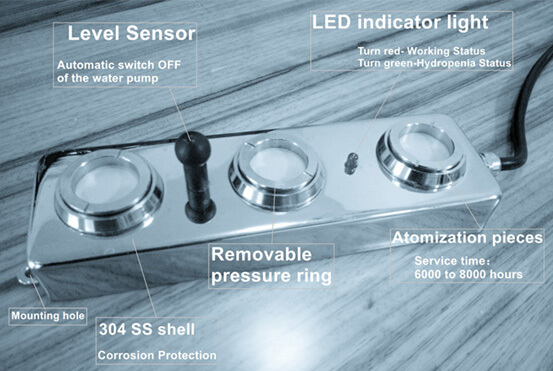 當一定聲強的超聲波通過液體指向氣液界面時,超聲波在此界面形成表面張力波,再與表面張力波相垂直的力的作用下產生震蕩,當振動面的振幅達到一定值,液滴即從波峰上飛出而形成霧化,其霧滴尺寸與波長成正比。
