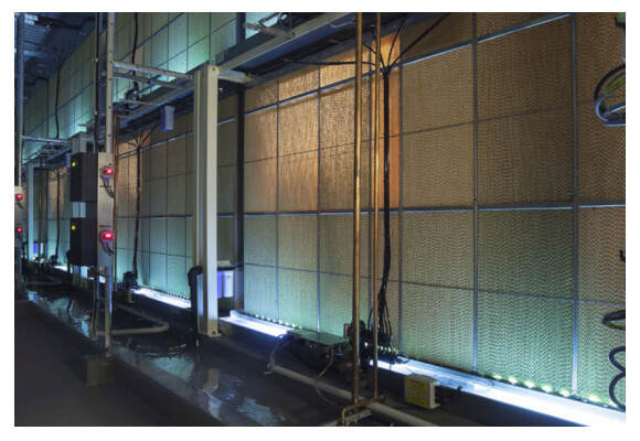空調機組加濕,是通過水箱中的水輸送到加濕器頂部的淋水器,水均勻地淋到濕膜的頂部,淋水器確保水均勻分配到濕膜材料上,水在重力作用下沿濕膜材料向下浸透,淋濕濕膜內部的所有層面,同時被濕膜材料吸收,形成均勻的水膜.當干燥的風通過濕膜材料時,干燥的空氣和濕潤的濕膜表面有較大面積的接觸,水份充分吸收空氣的熱量而汽化、蒸發,從而達到對空氣加濕的目的。在這一加濕過程中,空氣的濕度增加,溫度下降,但空氣的焓值不變。